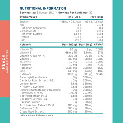 Sudedamosios dalys: Inulinas, maltodekstrinas, rūgštis (citrinų rūgštis), kvapioji medžiaga, lipnumą reguliuojanti medžiaga (silicio dioksidas), palmitoiletanolamidas, kiaulpienių šaknų ekstraktas (4:1), kalio citratai, N-acetil-L-cisteinas, cholino bitartratas (kaip VitaCholine®), kadagio uogos, saldiklis (sukralozė), burokėlių ekstraktas (4:1), vynuogių sėklų ekstraktas, hibisko milteliai, vitaminas C (L-askorbo rūgštis), artišokų lapų ekstraktas (5:1), vitaminas E (DL alfa tokoferilacetatas), goji uogų ekstraktas (5:1), kofermentas Q10, vitaminas K2 (menachinonas-7 (MK7)), Vitaminas D3 (cholekalciferolis), dažikliai (karotinai, burokėlių raudonis), cinko bisglicinatas, tiaminas (vitaminas B1), riboflavinas (vitaminas B2), selenas (L-selenometioninas).