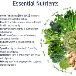 Sudedamosios dalys: Žirnių baltymų koncentratas, spirulinos milteliai, liucernos milteliai, miežių žolių milteliai, kviečių žolių milteliai, kopūstų milteliai, špinatų milteliai, brokolių milteliai, rėžiukai, petražolių milteliai, salierų milteliai (salierai), morkų milteliai, imbiero šaknų milteliai, burokėlių ekstraktas 4:1, liucernos daigų milteliai, žaliosios arbatos ekstraktas 95% (sudėtyje yra 45% EGCG), beta karotinas.