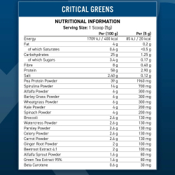 Applied Nutrition Critical Greens – maisto papildas miltelių pavidalu, skirtas kasdieniam vartojimui žmonėms, kurie nori lengvai papildyti savo mitybą vertingomis „žaliųjų“ grūdų, daržovių ir augalų ekstraktais. Formulė padeda palaikyti organizmo natūralias funkcijas, suteikia papildomą pagalbą imunitetui, virškinimui ir bendram energijos lygiui.