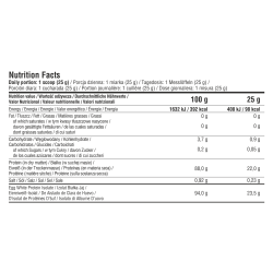 Sudedamosios dalys: 94% kiaušinio baltymo baltymų izoliatas; aromatas; emulsiklis: lecitinas*; saldiklis: sukralozė. *iš saulėgrąžų.