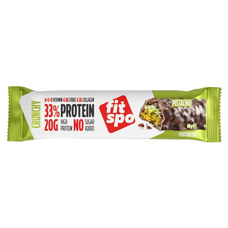 FitSpo Protein Bar Crunchy Pistachio 60 g - tai baltyminis batonėlis su traškiu pistacijų skoniu, sukurtas kaip skanus ir patogus baltymų šaltinis dienos metu ar po treniruotės. įtraukus jį į mitybą, galima papildyti dienos baltymų kiekį, padėti palaikyti raumenų masę ir atsistatymą, tuo pačiu mėgaujantis saldesniu, riešutiniu užkandžiu.