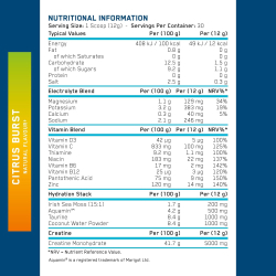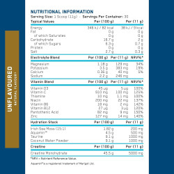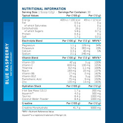 Sudedamosios dalys: kreatino monohidratas, kokosų vandens milteliai, taurinas, rūgštys (citrinų rūgštis, obuolių rūgštis), kalio citratai, magnio bisglicinatas, akvaminas™, kalcio bisglicinatas, Himalajų rožinė druska, airiškų jūros samanų ekstraktas (15:1), maltodekstrinas, natrio citratai, vitaminas C (L-askorbo rūgštis), lipnumą reguliuojanti medžiaga (silicio dioksidas), cinko bisglicinatas, niacinas (vitaminas B3), pantoteno rūgštis (vitaminas B5), vitaminas B6 (piridoksino hidrochloridas), tiaminas (vitaminas B1), vitaminas D3 (cholekalciferolis), vitaminas B12 (cianokobalaminas).