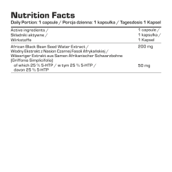 Sudedamosios dalys: afrikinių juodųjų pupelių (Griffonia simplicifolia) sėklų vandens ekstraktas (25 % 5-HTP); celiuliozės kapsulė (HPMC).