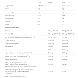 BLUE RAZZ: Citrulino malatas 2:1, beta alaninas, kreatino monohidratas, taurinas, arginino silikato inozitolis (kaip Nitrosigine®), kvapioji medžiaga, rūgštis (citrinų rūgštis), natrio bikarbonatas, cholino bitartratas (kaip VitaCholine TM ), lipnumą stabdančios medžiagos. Silicio dioksidas, kalcio silikatas, Himalajų rožinė druska, FitNox TM ( Moringa Oleifera ekstraktas, Punica Granatum ekstraktas, Kaempferia Parviflora ekstraktas), saldiklis (sukralozė), niacinamidas, AstraGin® ( Astragalus Membranaceus Root ekstraktas ir spalva), Brilliant Blue FCF (E133), vitaminas B12.