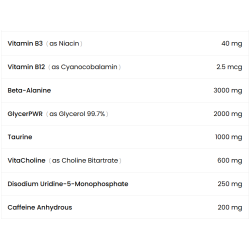 Sudedamosios dalys: vanduo, beta-alaninas, glicerisPWR (glicerolis 99,7%), taurinas (lipnumą mažinanti medžiaga; silicio dioksidas), rūgštingumą reguliuojančios medžiagos (fosforo rūgštis, obuolių rūgštis), vitacholinas (cholino bitartratas), dinatrio uridino-5-monofosfatas, bevandenis kofeinas, kvapiosios medžiagos, vitaminas B3 (niacinas), saldikliai (acesulfamas K, sukralozė, steviolio glikozidai iš stevijos), vitaminas B12 (cianokobalaminas)