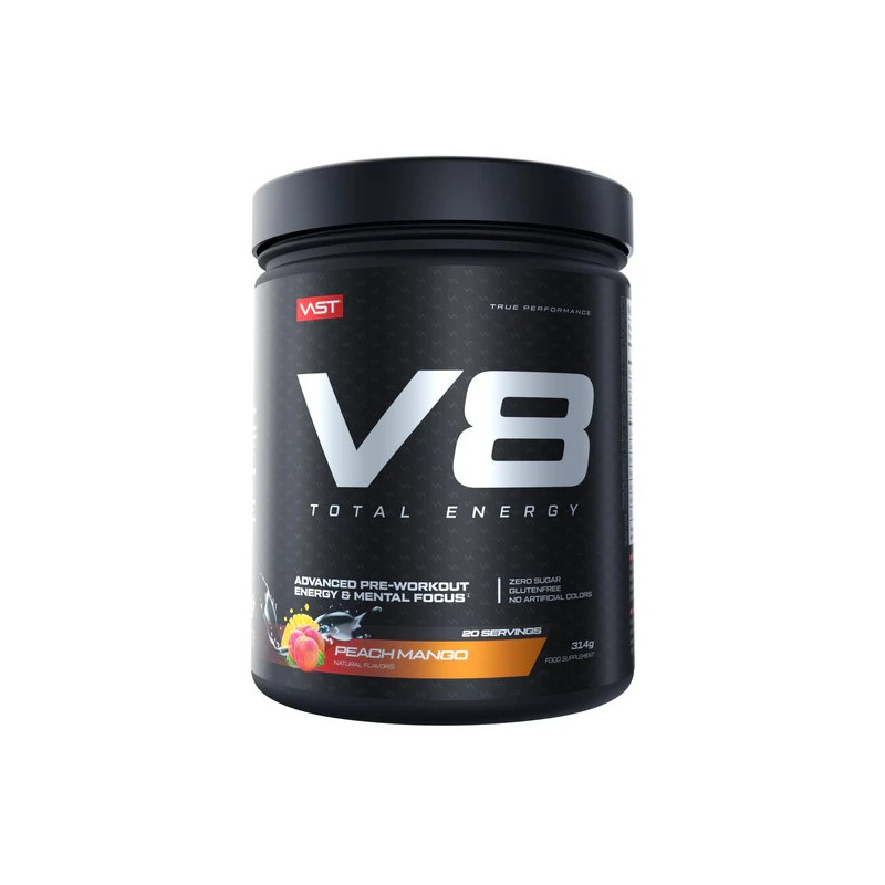 VAST V8 Total Energy formulė sukurta remiantis sportininkų poreikiais – jo sudėtyje esantys veiklieji junginiai padeda didinti fizinį našumą, atitolinti nuovargį ir pagerinti koncentraciją. Idealu intensyvioms treniruotėms ir varžybinėms situacijoms