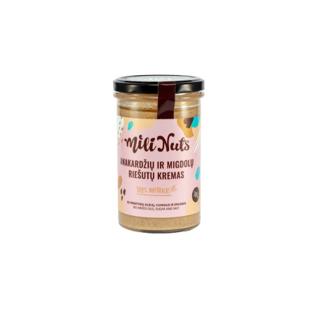 Mili Nuts Anakardžių ir migdolų riešutų kremas – tai skanus ir maistingas kremas, pagamintas iš aukščiausios kokybės anakardžių ir migdolų riešutų. Šis kremas suteikia unikalų, švelnų skonį ir puikiai tinka kaip užtepas ant duonos, blynų, skrebučių arba įvairių desertų. Be to, jis yra puikus papildas jūsų kasdienėje mityboje, nes suteikia vertingų maistinių medžiagų.
