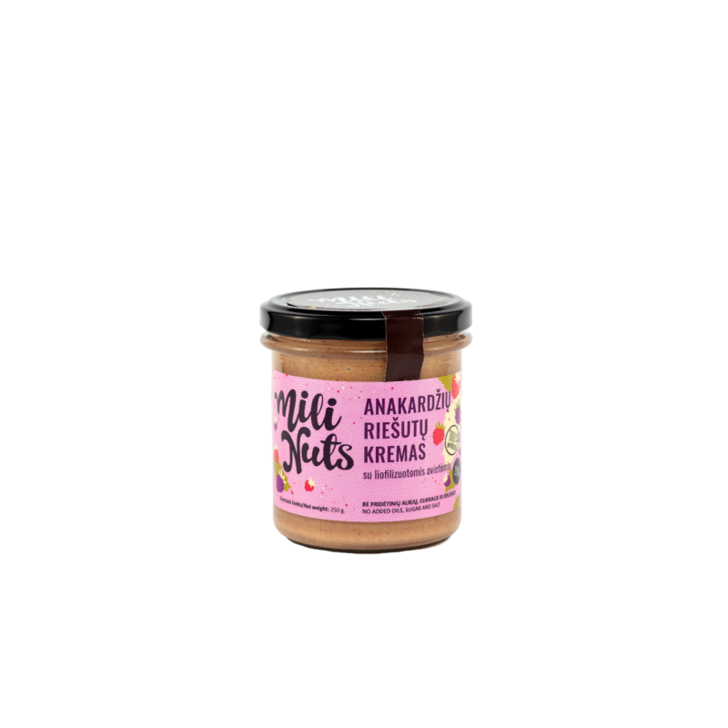 Mili Nuts Anakardžių riešutų kremas su liofilizuotomis avietėmis – tai skanus ir maistingas kremas, pagamintas iš aukščiausios kokybės anakardžių riešutų ir natūralių liofilizuotų aviečių. Šis kremas puikiai dera su švelniu anakardžių riešutų skoniu ir aviečių vaisišku gaivumu, suteikdamas ne tik malonų, bet ir unikalų skonį. Jis puikiai tinka kaip užtepas ant duonos, blynų, skrebučių, kaip desertų priedas arba tiesiog kaip skanus užkandis bet kuriuo paros metu.