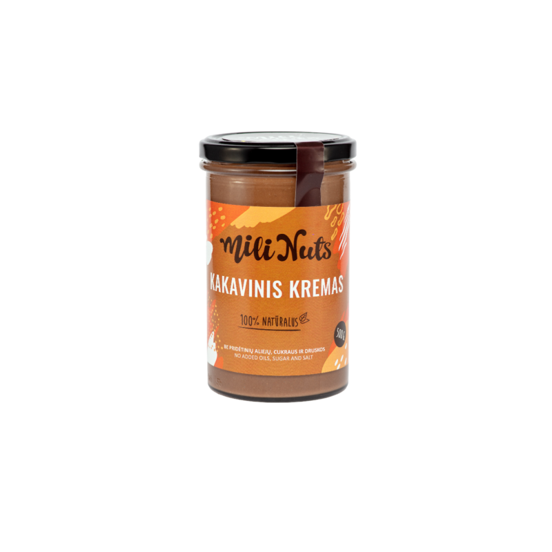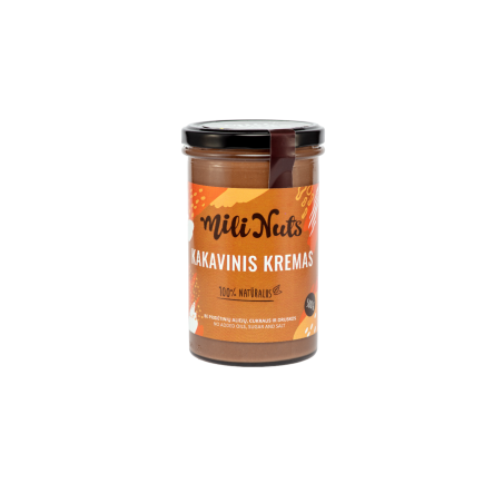 Mili Nuts Kakavinis riešutų kremas – tai skanus ir maistingas kremas, pagamintas iš aukščiausios kokybės riešutų ir kakavos, suteikiantis unikalų šokoladinį skonį. Šis kremas yra puikus pasirinkimas tiek kaip užtepas ant duonos, blynų, skrebučių, tiek kaip priedas prie desertų arba tiesiog kaip energijos šaltinis kasdienėje mityboje. Kakavinis riešutų kremas puikiai tinka norint pasimėgauti švelniu šokoladiniu skoniu be pridėtinių dirbtinių saldiklių ir konservantų.