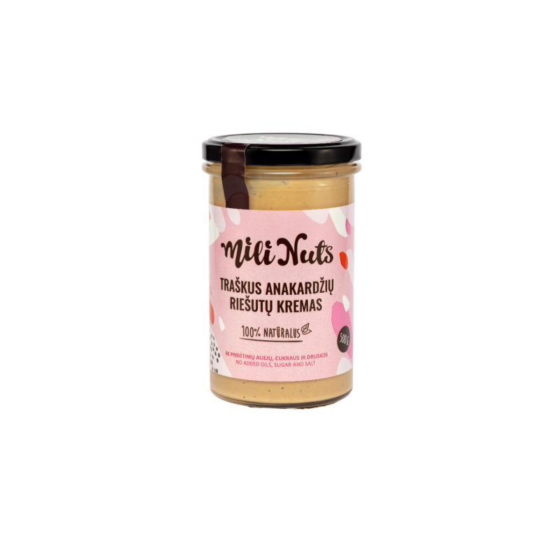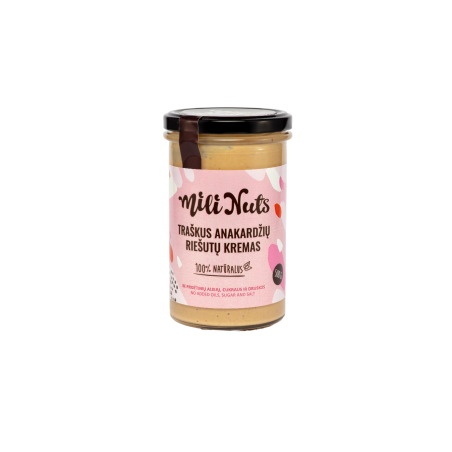 Mili Nuts Traškus anakardžių riešutų kremas – tai skanus ir išskirtinis kremas, sukurtas iš aukščiausios kokybės anakardžių riešutų, su subtiliu traškumo prieskoniu, suteikiančiu kremui malonų tekstūrinį kontrastą. Šis kremas pasižymi švelniu ir lengvai saldžiu skoniu su traškiais riešutų gabalėliais, kurie puikiai tinka tiek kaip užtepas ant duonos, blynų, skrebučių, tiek kaip priedas desertams ar tiesiog kaip skanus užkandis.
