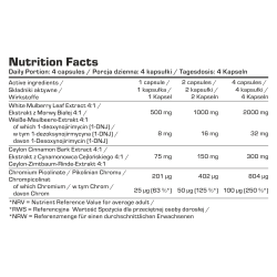 Sudedamosios dalys: Baltojo šilkmedžio lapų ekstraktas 4:1 (Morus alba L.); Ceilono cinamono žievės ekstraktas (Cinnamomum verum); chromo pikolinatas; celiuliozės kapsulė [HPMC].
