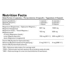 Sudedamosios dalys: Buferinis magnio bisglicinatas; vitaminas B6 (piridoksino hidrochloridas); celiuliozės kapsulė (HPMC).