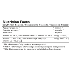 Sudedamosios dalys: Vitaminas K MK-7 iš natto (menaquinone-7), vitaminas D3 iš lanolino (cholecalciferolis), užpildas: MCT kokosų aliejus, antioksidantas: alfa-tokoferolis; kapsulės apvalkalas: galvijų želatina; drėgmę išlaikanti medžiaga: glicerolis.