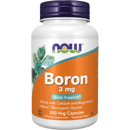 Now Boron 3 mg kapsulėse esantis boras padeda palaikyti kaulų stiprumą, normalų hormonų balansą ir užtikrina geresnį kalcio, magnio bei vitamino D pasisavinimą organizme, prisidedant prie bendros sveikatos