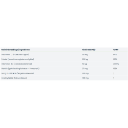 • Šiame komplekse, be geležies, yra ir vitaminas C, kuris padeda geriau pasisavinti geležį iš virškinimo sistemos. Taip pat yra folio rūgšties ir vitamino B12, kurie padeda palaikyti sveiką kraujodaros funkciją ir bendrą kraujo sveikatą.
