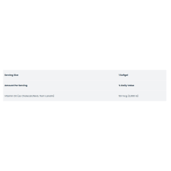 Sudedamosios dalys: vitaminas D3 (kaip cholekalciferolis) (iš lanolino), ekstra tyras alyvuogių aliejus; kapsulė (galvijų želatina, glicerinas ir vanduo), saflorų (safflower) aliejus.